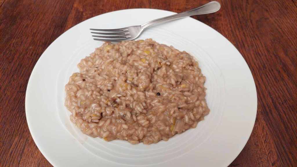 Pour le risotto : 300 g. de riz carnaroli (ou autre) affiné, une échalote, un poireau, quelques gouttes de vinaigre balsamique, 2 dl de vin rouge (Valpolicella ripasso), 80 g. de parmesan 60 mois, 20 g. de beurre, poivre noir du moulin, cannelle, huile extra vierge d’olive, bouillon (filtré).