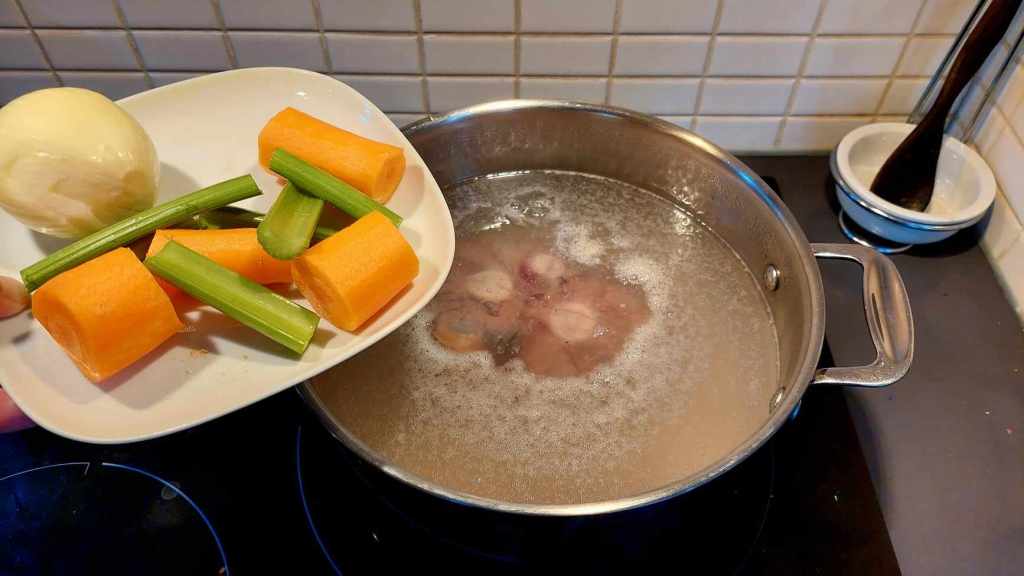 … puis au moment de l’ébullition, le reste des ingrédients, oignon, carotte et céleri.
