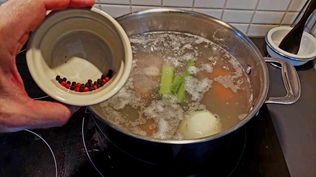 Pour donner du « piment » au bouillon, ajoutez quelques grains d’épices. A savoir, du poivre noir et des baies roses.