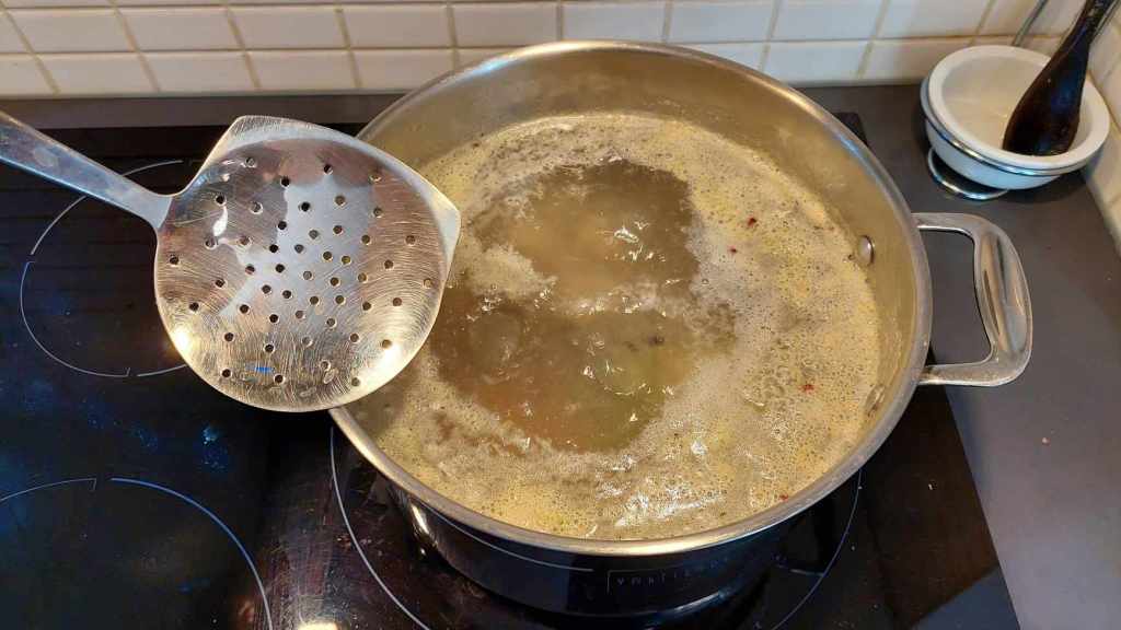 Attention : avant de baisser la flamme, il faudra éliminer l’excès d’écume qui se crée sur la surface. Après quoi le bouillon pourra mijoter tranquillement pendant au moins deux heures, en compagnie d’un peu de gros sel.