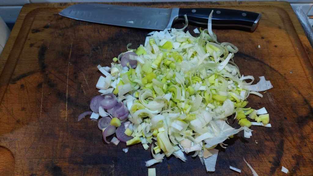 On y est presque. Le bouillon désormais prêt, il faudra le filtrer en mettant de côté les légumes et la viande. Ensuite, on émincera une échalote et un poireau…