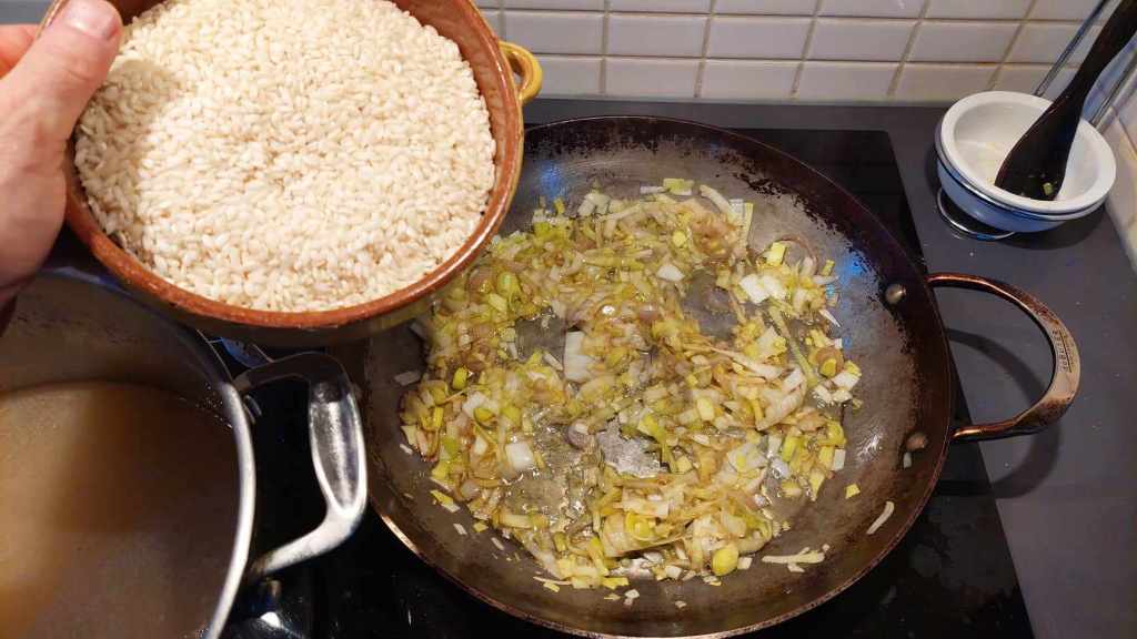 … et c’est parti pour le risotto. Les légumes devront rissoler à feu doux dans un peu d’huile extra vierge d’olive, assaisonnés de quelques gouttes de vinaigre balsamique. Le riz, lui, devra être torréfié pour prendre un peu de couleur.