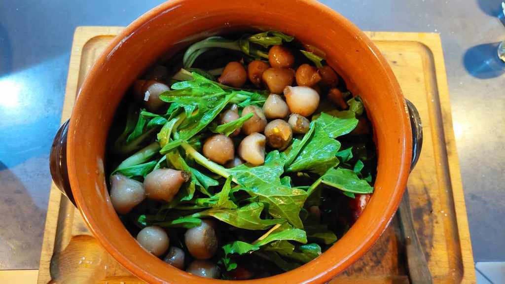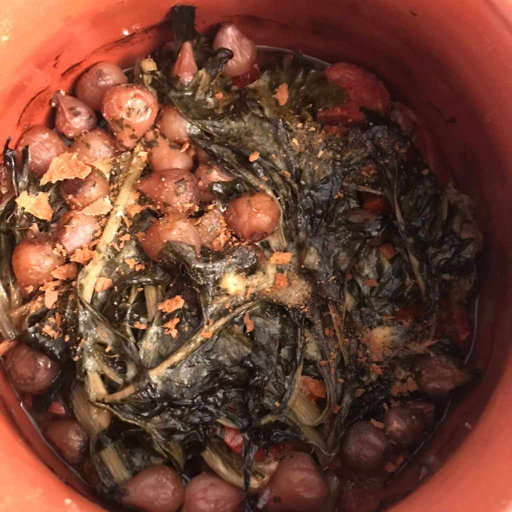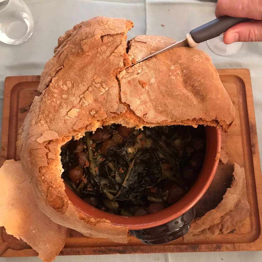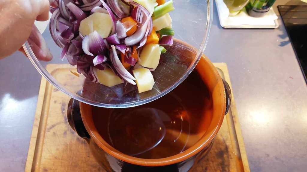 La suite est simple. Il suffit de couper en morceaux les légumes et de les placer en premiers dans la pignatta en terre cuite (avec un peu d’huile extra vierge, du gros sel et quelques aromates).