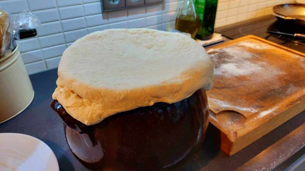 Pour la cuisson, ne couvrez pas avec un couvercle en céramique, mais, comme le veut la tradition, d’une belle pâte à pizza, simple mélange de farine, eau et sel.