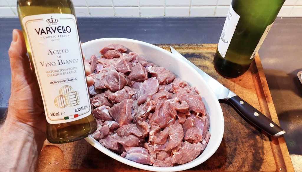 L’odeur et la saveur de la bête qui broutait des mois dans la nature pouvaient être un peu forts. Par conséquent, les bergers laissaient mariner la viande quelques heures dans une marinade de vin blanc et de vinaigre de vin (blanc, lui aussi). J’ai effectué la même opération, en ajoutant quelques plantes de la garrigue et du poivre de moulin.