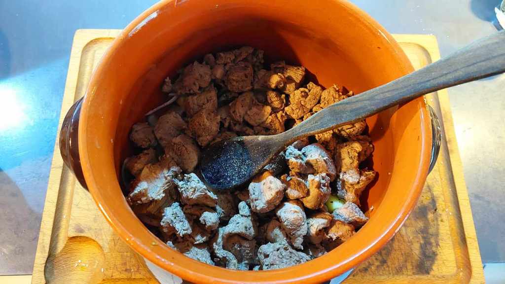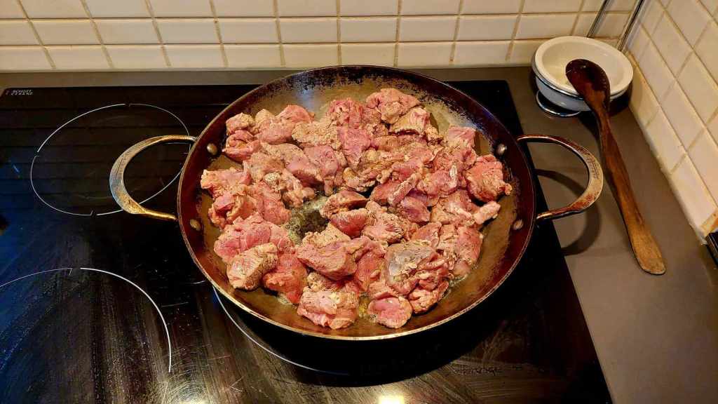 Le jour J, j’ai retiré la viande de la marinade et l’ai faite sauter quelques minutes dans une poêle à feu vif avec un peu d’huile extra vierge d’olive, de façon qu’elle puisse perdre un peu du jus de cuisson. Après quoi, je l’ai mise de côté.