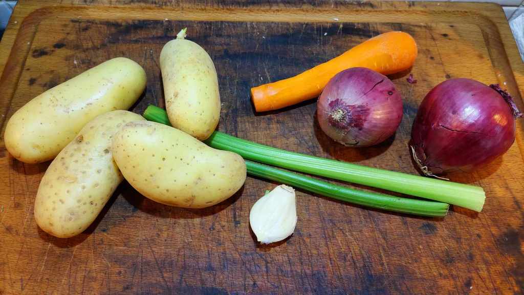 A présent, la garniture. Elle est composée de quelques oignons rouges, de céleri, d’une gousse d’ail, d’une carotte, de quelques pommes de terre…