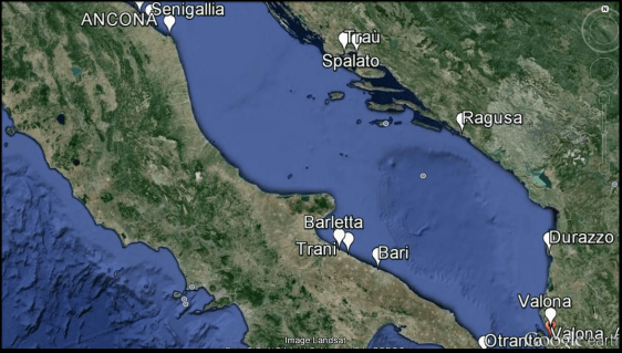 Mais quel lien avec Ancône et ses escargots? Voilà le topo. La mer Adriatique est, en quelque sorte, un bassin clos. La distance entre les côtes italiennes et croates est en moyenne de 176 milles marins, c’est-à-dire 325 km seulement. A partir du XIème siècle, la libre république maritime de Ragusa établit des liens solides avec sa jumelle Ancône, elle aussi ville grecque, de marins et construite pareillement sur des falaises abruptes, au milieu de côtes rocheuses…