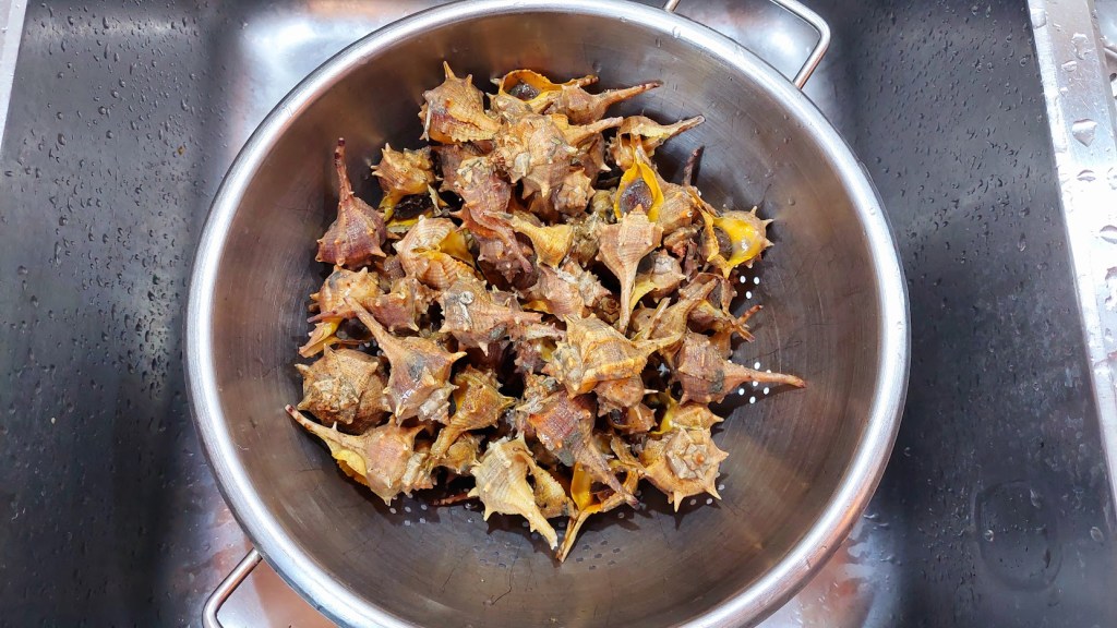 J’ai déniché heureusement un site français en ligne qui propose de murex (vivants) pêchés en Méditerranée, dans les eaux de la petite Camargue. J’en ai commandé un kilo (avec la coquille) au prix de 20 euros, ce qui est suffisant pour préparer un antipasto (hors d’oeuvre) nourrissant pour quatre personnes.