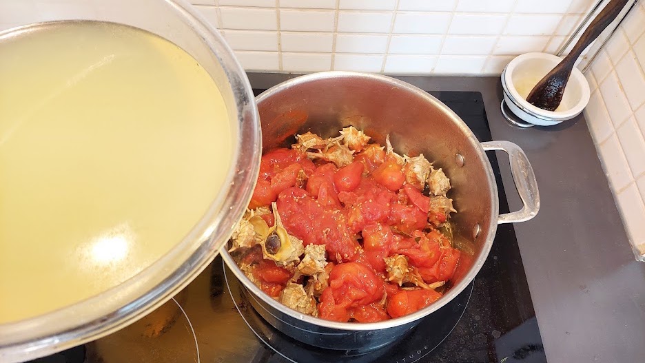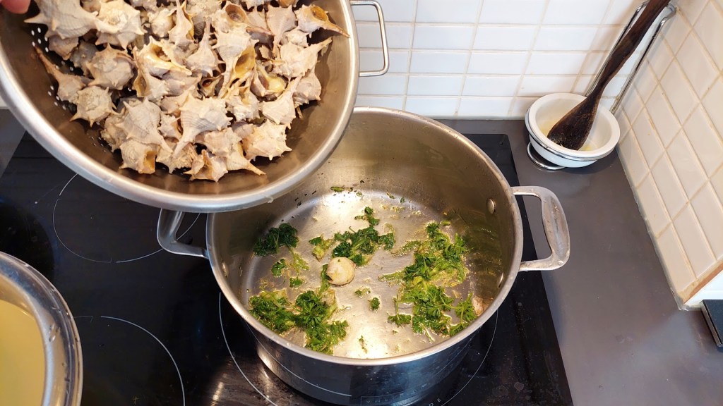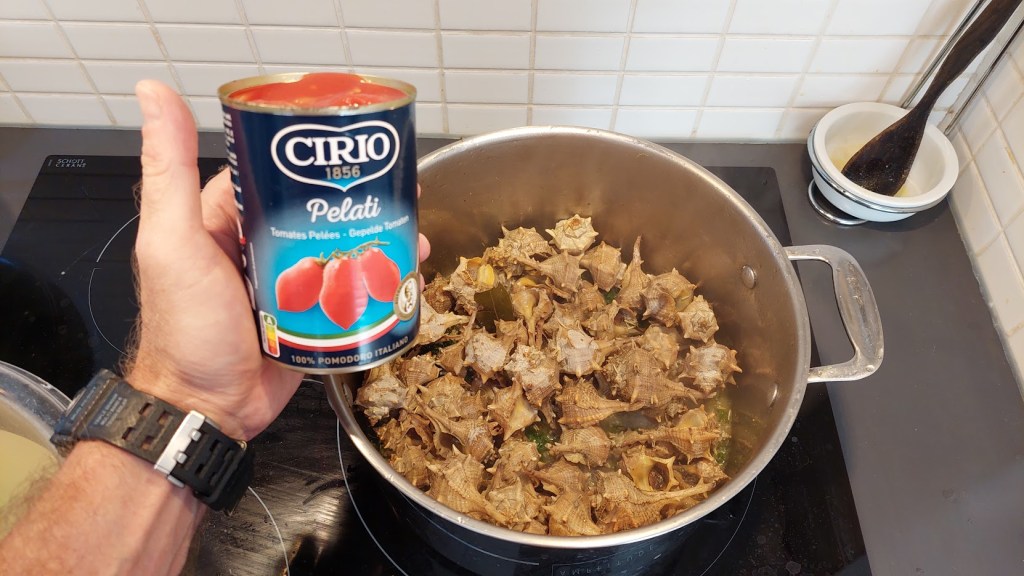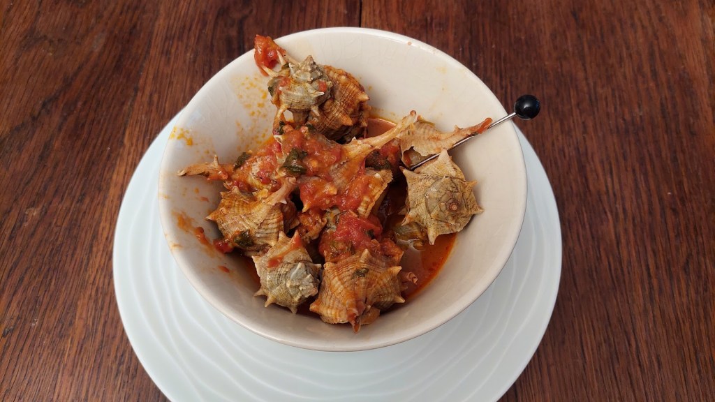 Ingrédients pour 4 personnes : 1 kg de raguse ( murex ou bolinus brandaris, à ne pas confondre avec leurs cousins de la Manche, les bulots); 1 oignon, du fenouil sauvage (ou barbe de fenouil commun), 1 gousse d’ail, un verre de vin blanc sec, 400 g. de tomates concassées, piment rouge en poudre, sel, poivre.