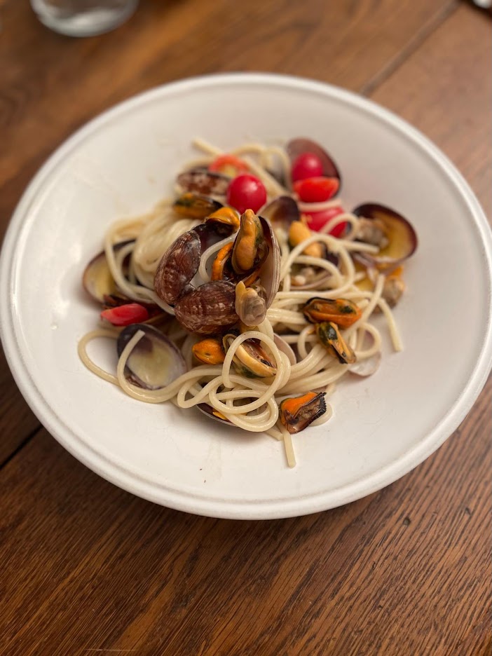 Au fait, avant que je n’oublie : après cet hors-d’oeuvre, je vous conseille un bon plat de pâtes aux vongole (palourdes) et moules. Enjoy !