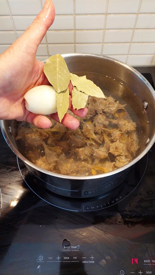Ajoutez aussi l’eau de cuisson que vous aviez mise de côté. Salez, poivrez (beaucoup), laissez cuire une heure…