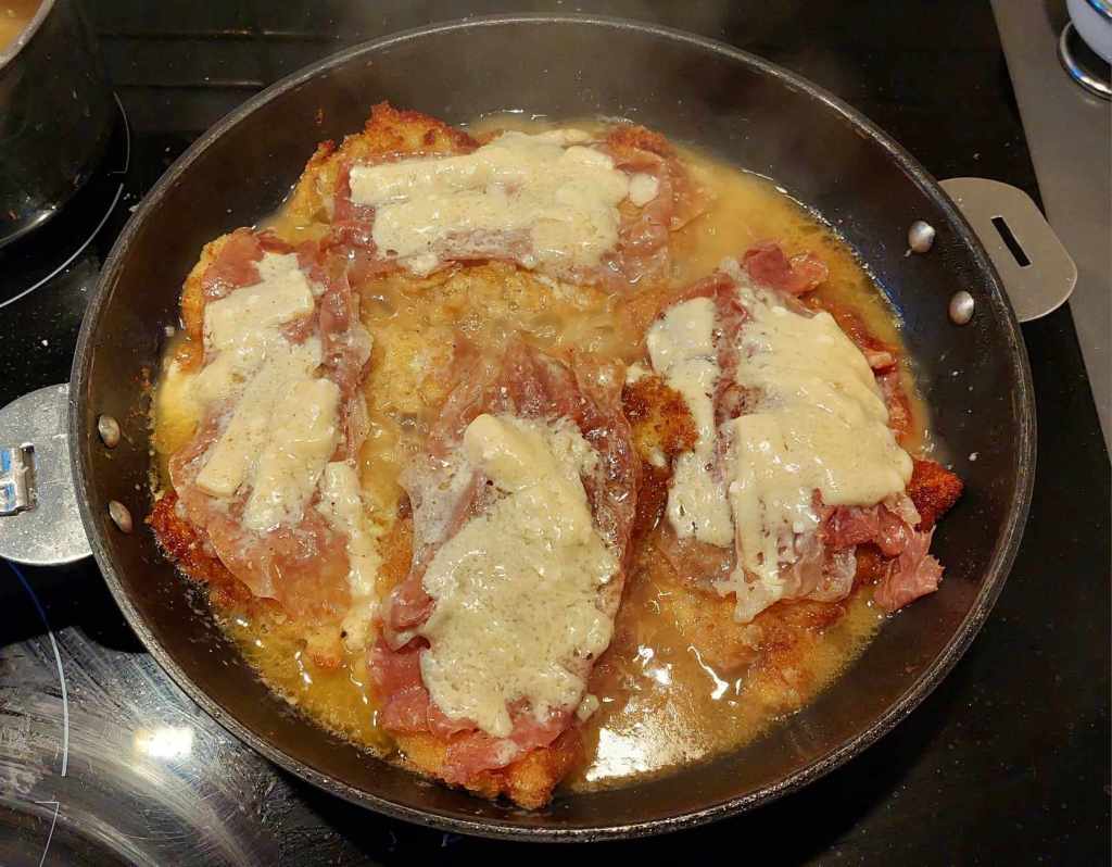 Puis mettez-y les escalopes, et faites cuire à feux doux, seulement d’un côté, le temps que le fromage fonde.