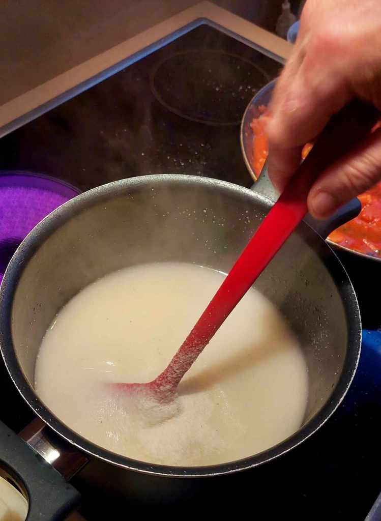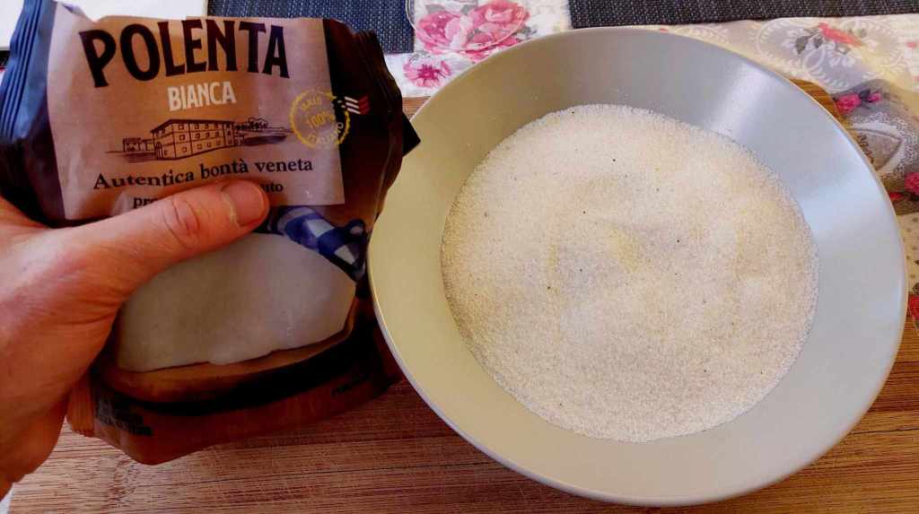 Le moment venu, préparez la garniture traditionnelle, la polenta de maïs, l’autre élément « allogène » de la recette (en plus de la tomate), mais tout de même utilisé en Italie depuis la moitié du XVIe siècle. En particulier, il faut utiliser la variété de semoule blanche (le Biancoperla), plus délicate et typique de la Vénétie.