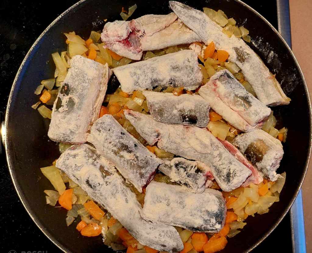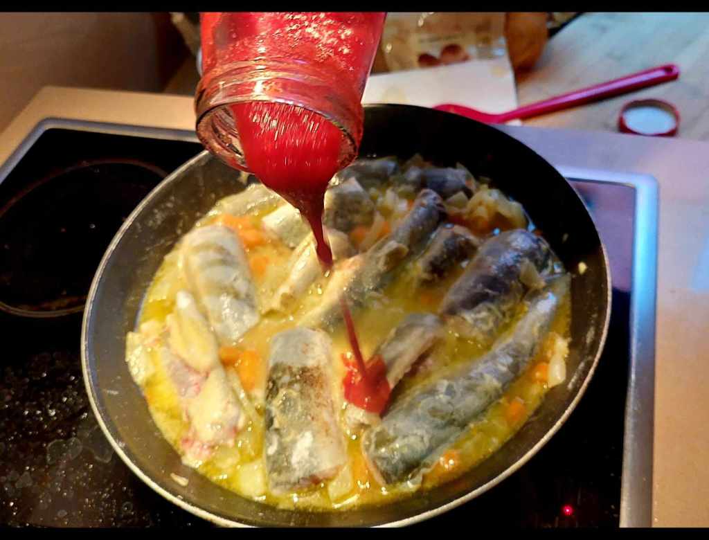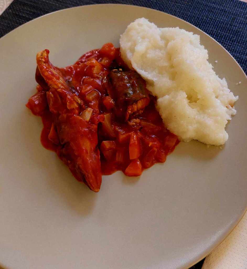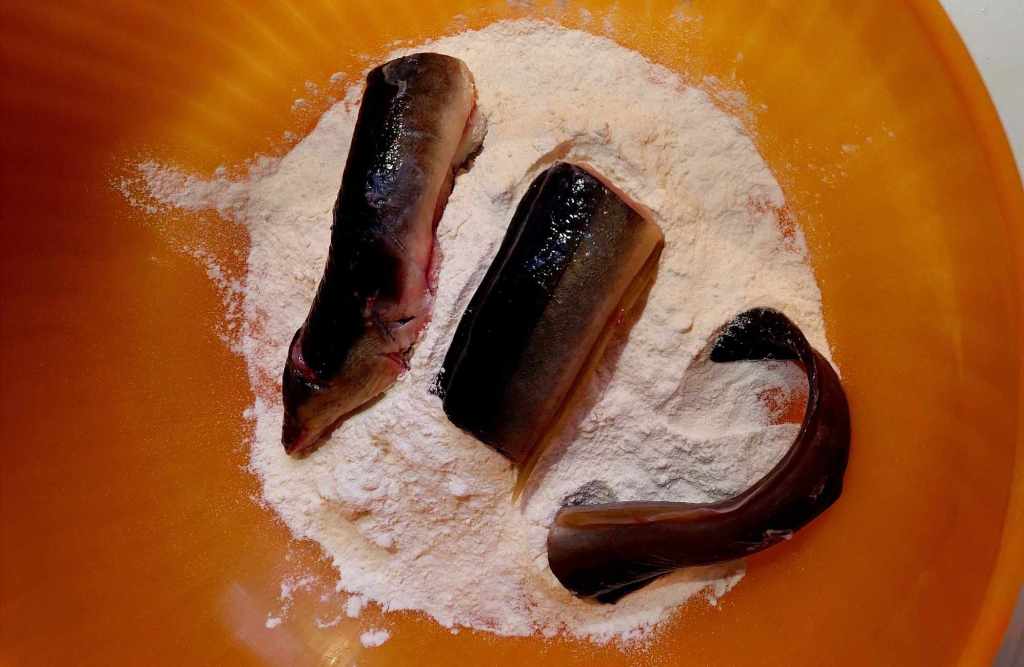 Ingrédients pour 4 personnes : 1,2 kg d’anguille (jeune, plus tendre et moins épaisse), 1/2 litre de vinaigre blanc, 1 verre de vin blanc sec, farine 00 de blé, farine de maïs, pulpe de tomates, sel, poivre, oignon, ail, carottes, fenouil, laurier, basilic, persil.