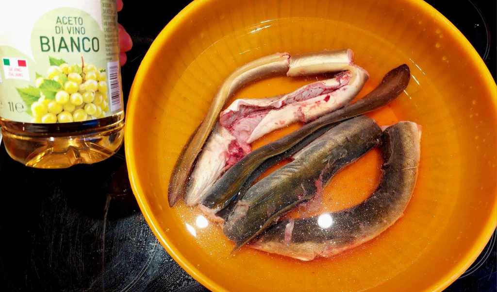 Il me restait à choisir la façon de les cuisiner. La recette la plus commune dans la Vénétie depuis toujours est le bisato in tecia, où tecia est le tegame (du grec ancien τηγάνιον, poêle en français). Tout d’abord, il faut laisser deux heures les anguilles – déjà vidées, lavées et divisées en tronçons d’environ dix centimètres sans les séparer les unes des autres – dans un bol avec de l’eau froide et un demi litre de vinaigre blanc, quelques feuilles de laurier et du poivre en grains, pour parfumer leur chair.