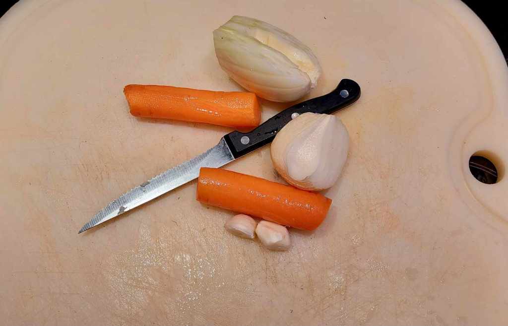 Faites ensuite chauffer un peu d’huile extra vierge d’olive dans une large poêle (autrefois en terre cuite), assaisonnez avec de l’ail écrasé et retirez-le. Ajoutez ensuite des carottes, un morceau de fenouil et de l’oignon en mirepoix, et laissez réduire à couvert un bon moment.