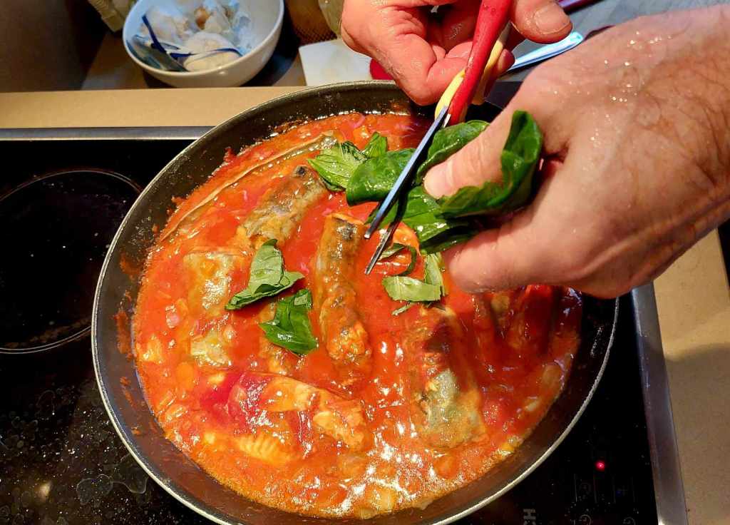 Sans oublier quelques feuilles de basilic. Recouvrez à nouveau et laissez mijoter une bonne demi heure à feu doux.