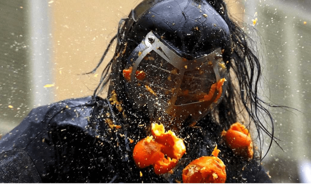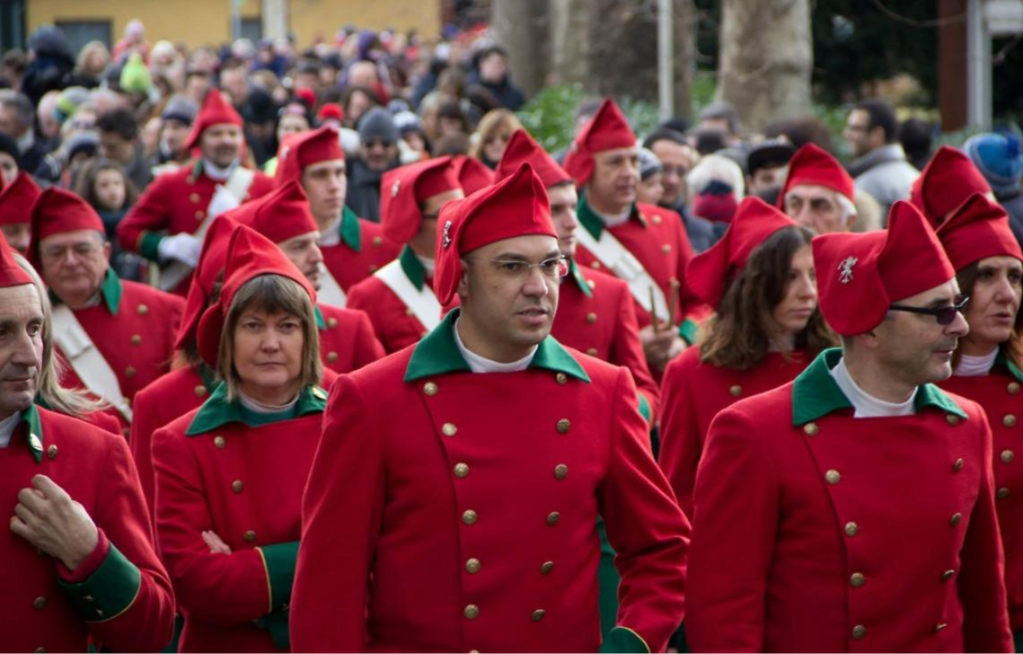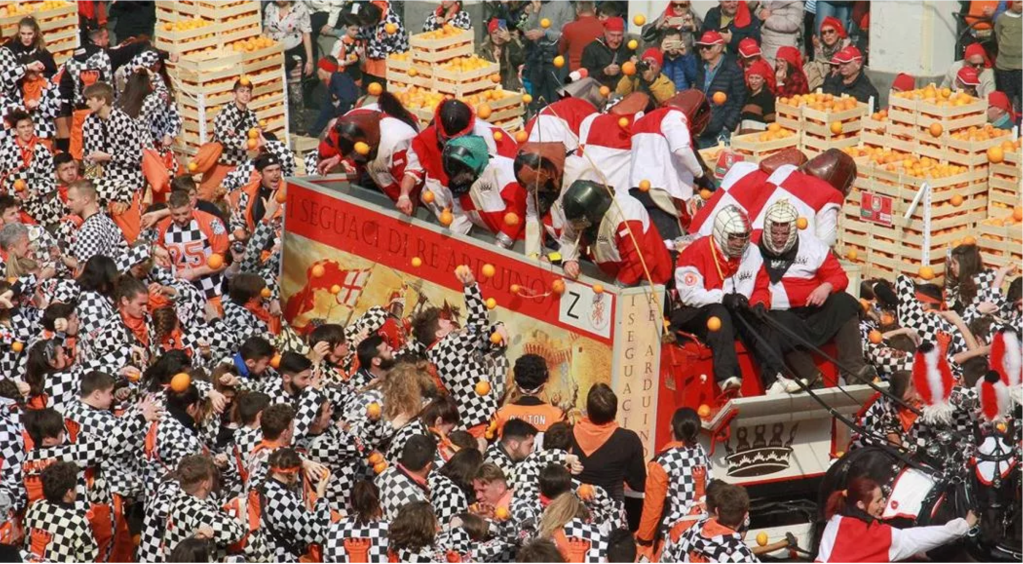 Après guerre, le carnaval d’Ivrée prit sa forme définitive, avec la très célèbre bataille des oranges. Pendant trois jours, les équipes des rioni à pieds (environ 8000 personnes) balancent (et reçoivent) des agrumes contre les soldats – 2000 – du tyran, juchés sur 50 chars tirés par des chevaux. Aux dernières nouvelles, mille tonnes d’oranges de Calabre et de Sicile sont utilisées chaque année comme projectiles, avec plus de 500 blessés (y compris les animaux). Le tout pour une coquette somme d’un million d’euro en frais d’organisation, plus un over-tourisme de 120.000 personnes dans une ville qui compte 22.000 habitants. Un gâchis insensé pour certains, un bénéfice énorme pour d’autres. Si ce n’est pas encore et toujours la fête des fous…