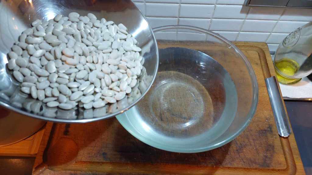 Dernier point sur les haricots à utiliser. A Ivrée, il existe deux variétés, les borlotti (rouges) ou les cannellini (blancs) de Saluggia, LA localité piémontaise des légumes secs. Mais à Paris, inutile d’en chercher. J’ai opté pour ceux de Tarbes… qui hélas sont désormais introuvables. J’ai découvert en effet qu’ils sont devenus un produit de niche, il m’a fallu donc les commander sur internet. Bref… la veille du jour J, on les fera tremper dans de l’eau froide (avec un peu de bicarbonate alimentaire), une nuit entière.