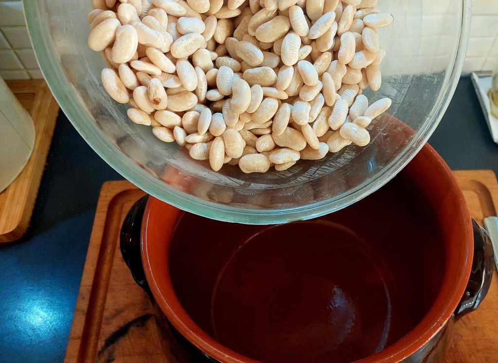 N’ayant pas la tufeja, j’ai utilisé mon vieux pot en céramique des Pouilles, proud tradition. On commence avec les haricots qu’iront tout au fond…
