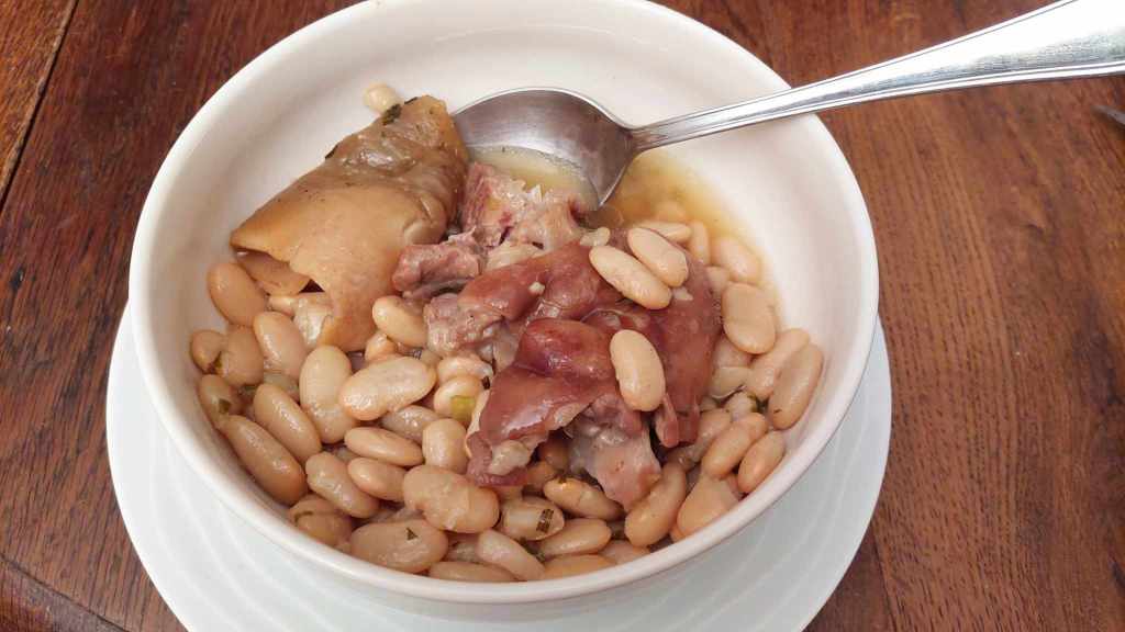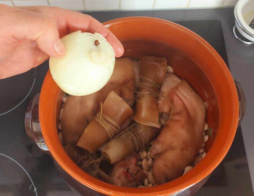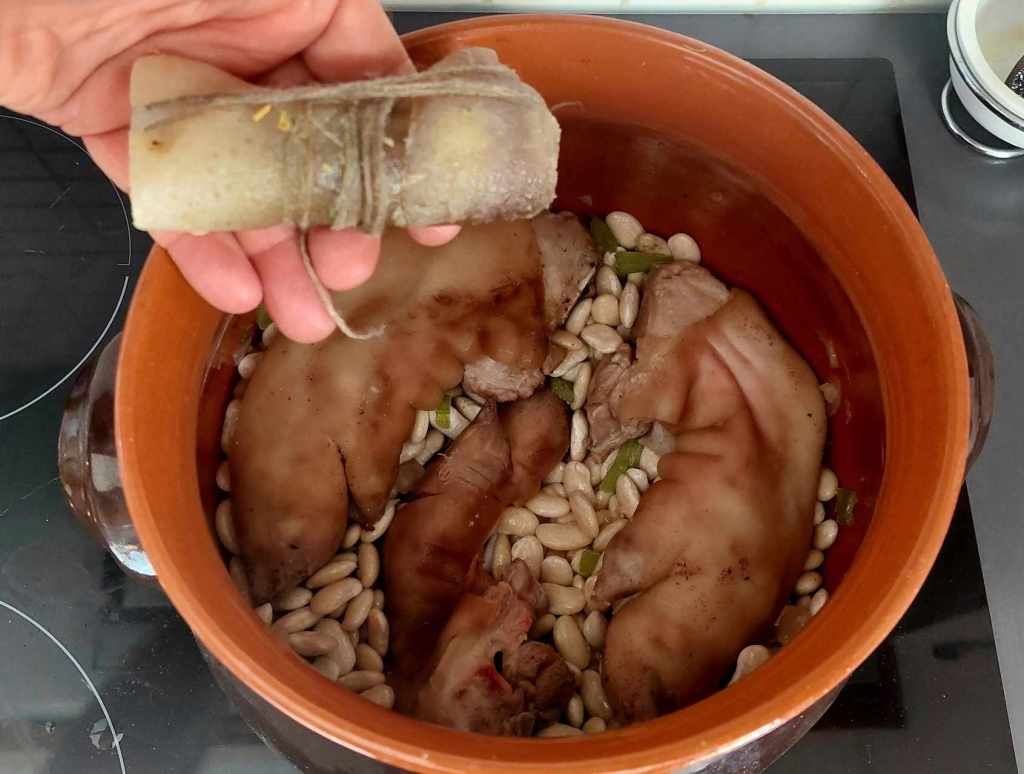Ingrédients pour 4 personnes : 350 g. de haricots (borlotti ou cannellini), deux pieds de cochon, environ 100 g. de couenne, un morceau de lard, une branche de céleri, un oignon moyen, un autre oignon pour le clou de girofle, deux gousses d’ail, gros sel, poivre, aromates en tout genre.