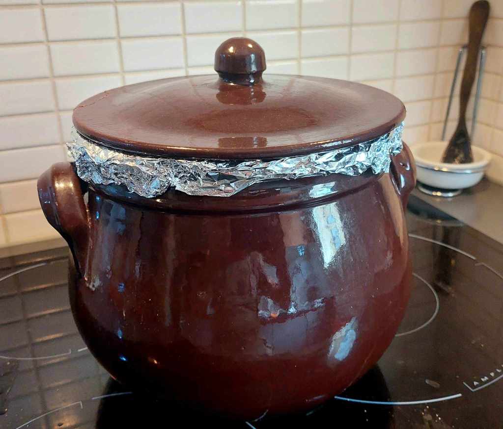 Allumez le four à 160°, et avant de mettre le pot à son intérieur, scellez-le avec de la pâte à pizza (mélange de farine, eau et sel), ou bien, avec une feuille de papier aluminium, ça ira plus vite.