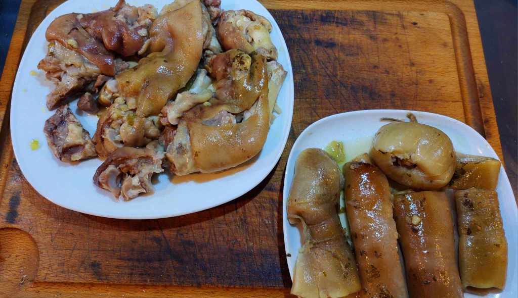 Une fois la cuisson terminée – moi j’ai laissé mijoter 4 heures et demi – ouvrez le pot, mettez de côté l’oignon, les prejivi (sans la ficelle), les pieds…
