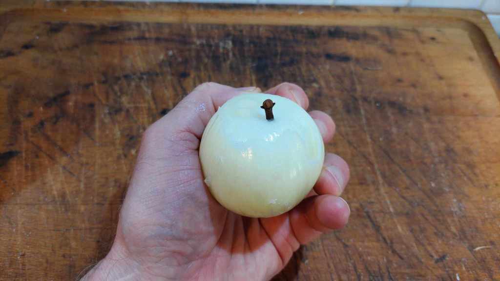 Passons aux autres ingrédients. D’abord, épluchez un oignon blanc, et enfoncez-y un ou deux clous de girofle, pour l’aromatiser.