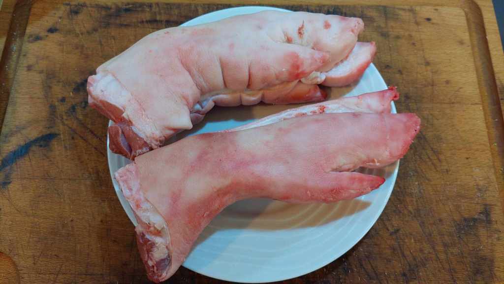J’ai choisi une version soft de la recette (il y en a des dizaines), et j’ai commandé chez le boucher deux pieds de cochon, sciés dans le sens de la longueur (mais vous pouvez aussi les demander en rondelles)…
