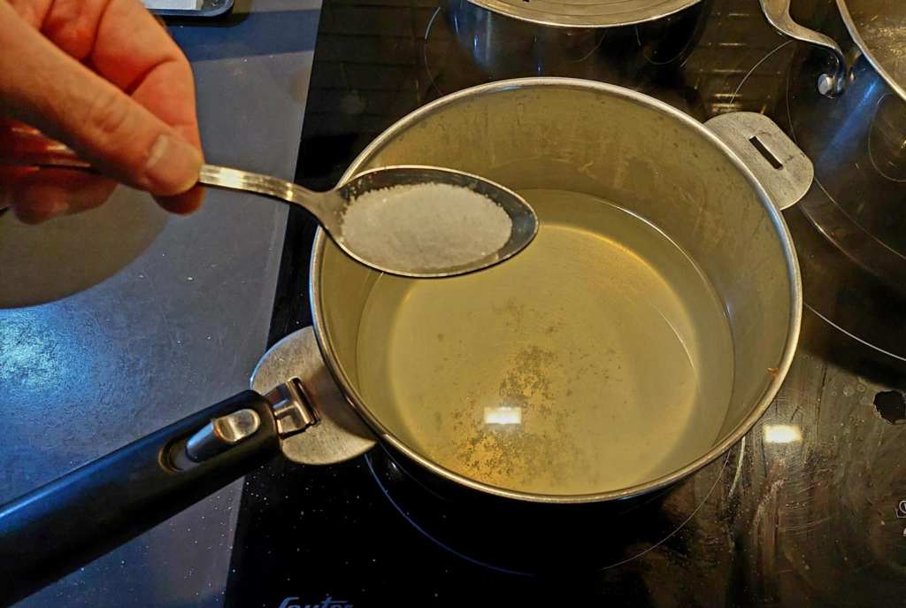Ensuite, après avoir retiré les écorces, on fait dissoudre dans l’infusion 15 grammes de sel fin (environ une cuillère à soupe).