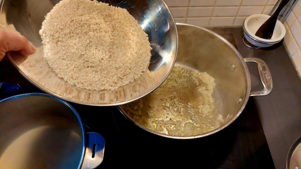 Et à present, le risotto ! Dans la même casserole utilisée pour faire torréfier les crevettes, ajoutons le riz carnaroli, qui devra torréfier lui aussi une ou deux minutes avec un fil d’huile extra vierge d’olive, avec un petit oignon émincé, une pincée de sel fin et du poivre.