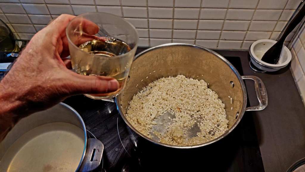 Une fois la torréfaction achevée, ajoutons un verre de vin blanc sec, et attendons qu’il évapore.