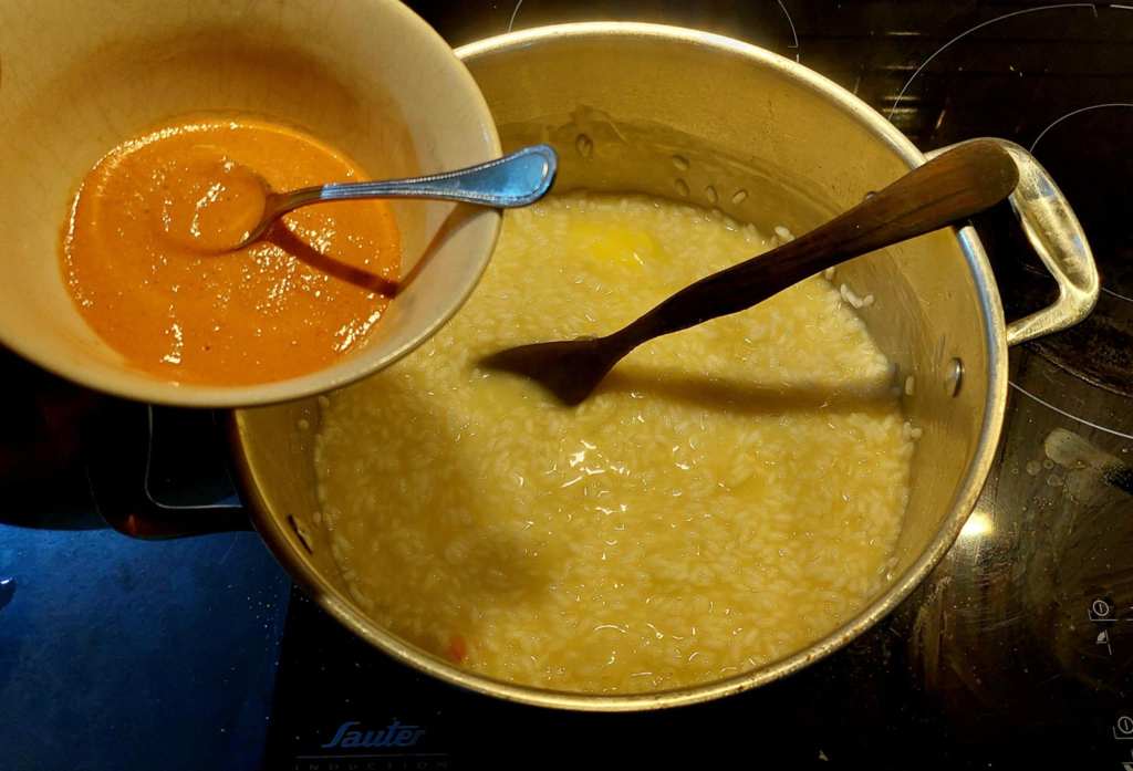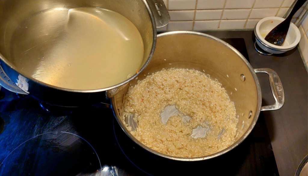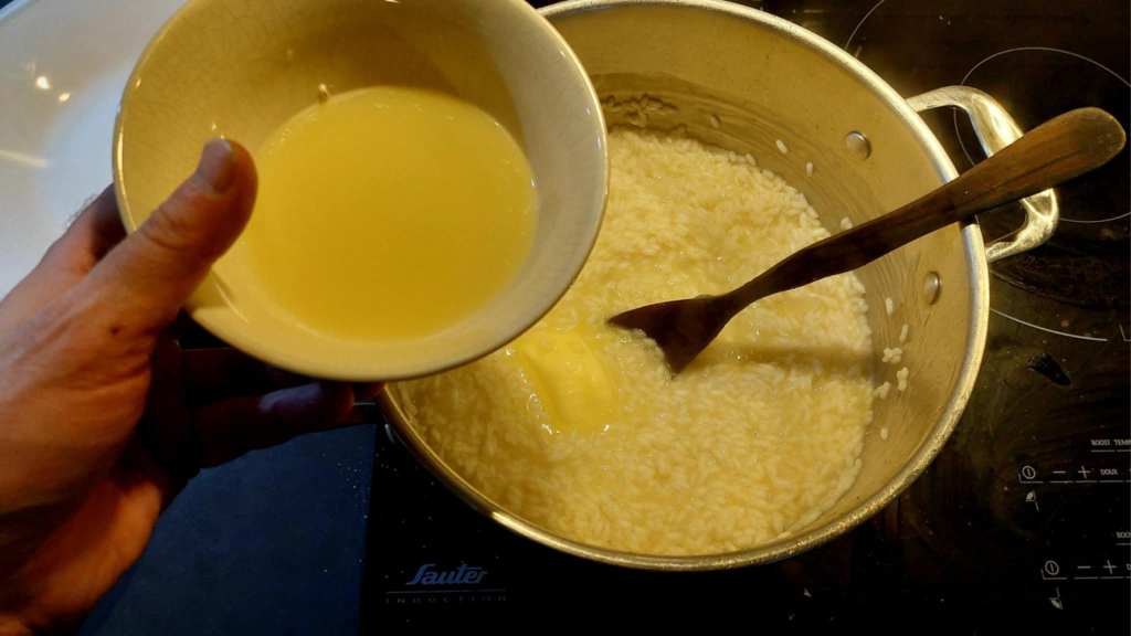 C’est le moment de l’infusion de tout à l’heure, à ajouter chaude au riz, qui doit cuire pendant 10 à 15 minutes, en touillant à l’aide d’une cuillère en bois. La flamme doit rester moyenne ou faible, l’essentiel étant que le riz puisse cuire à feu doux. Mais si l’infusion devait réduire trop, une ou deux louches de bouillon végétal ne seront pas de trop.