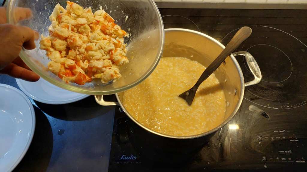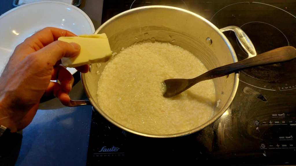 On y est presque. Le temps écoulé et le feu éteint, pour rendre le riz plus moelleux, rien de mieux qu’un bon morceau de beurre, à faire fondre (en dehors de la plaque chaude) dans l’ensemble, toujours à l’aide d’une cuillère en bois.