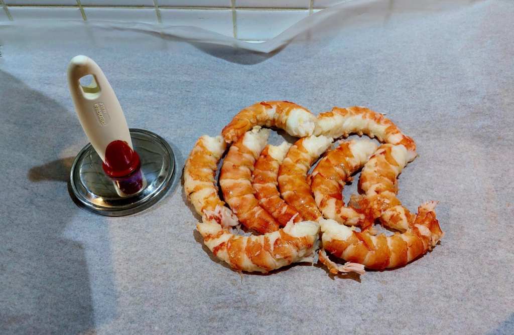 Pour respecter la recette, qui prévoit un battuto (tartare) de crevettes, j’ai d’abord lavé les crustacés sous l’eau courante, puis je les ai décortiqués. Attention, il ne faut pas jeter les carapaces et les têtes, elles seront utilisées pour la sauce. Quant aux bestioles, ainsi dénudées, elles ont été posées sur une double feuille de papier sulfurisés. L’idée est de les recouvrir avec l’une des moitiés du papier, et de les aplatir doucement avec un attendrisseur.