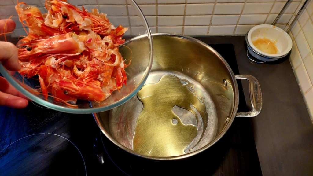 Revenons aux têtes et aux carapaces : elles doivent être torréfiées dans une casserole avec un filet d’huile d’olive extra vierge pendant deux bonnes minutes, avant d’ajouter une petite tasse à café d’eau. Une fois le feu éteint, on passe les restes dans le robot mixeur.