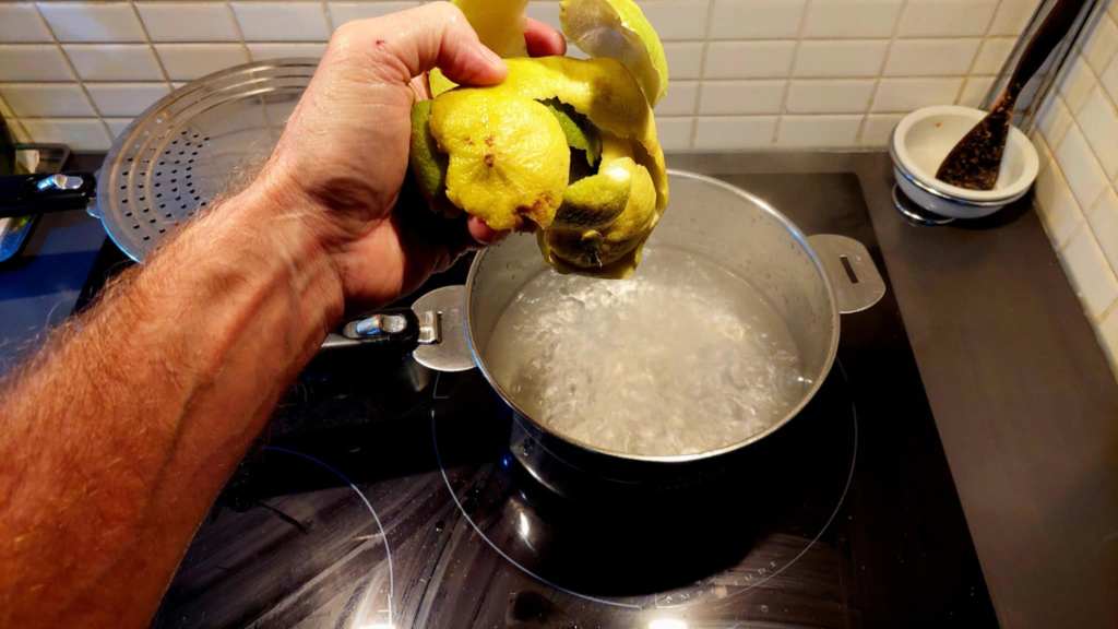 La première étape consiste à éplucher délicatement les bergamotes, en gardant seulement la couche externe sans la partie blanche. Ensuite, on fait réchauffer une quantité d’eau (3 fois le poids du riz prévu) dans une casserole. Dès qu’elle arrive à ébullition, on y ajoute les écorces, qui doivent infuser à couvert pendant 5 minutes.