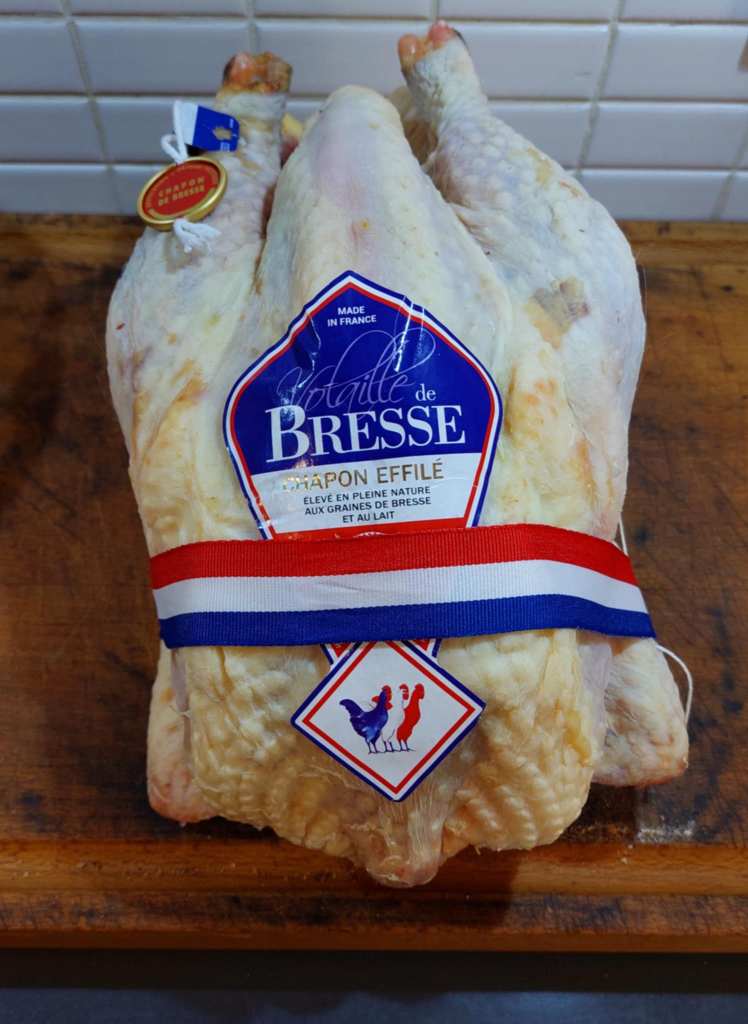 Impressionné par un tel pedigree, je ne pouvais pas ne pas m’équiper du roi des chapons, ceux de Bresse. Voici donc un joli spécimen médaillé et effilé (dont on a retiré seulement le fil de l’intestin), d’un poids de 3,200 kg (avant d’être vidé, et avec encore toute ses os). Il est vrai qu’il coûte beaucoup plus cher qu’un chapon ordinaire, mais au final on y a mangé à six, et le lendemain avec le rab j’ai obtenu encore de quoi faire un risotto pour quatre personnes…