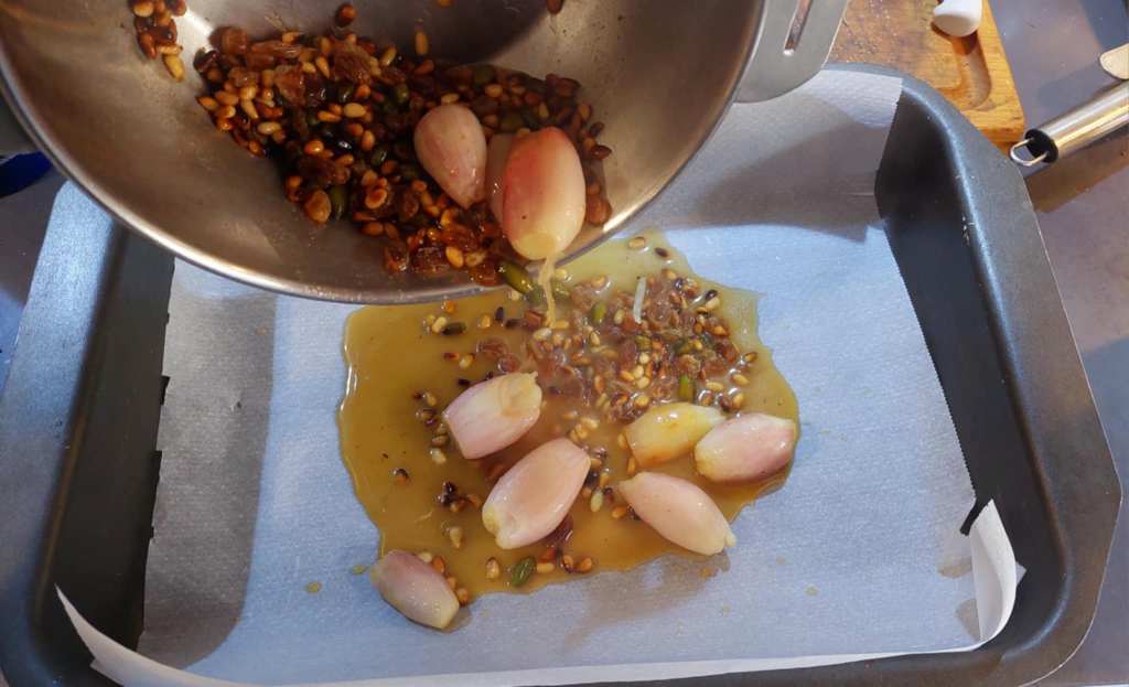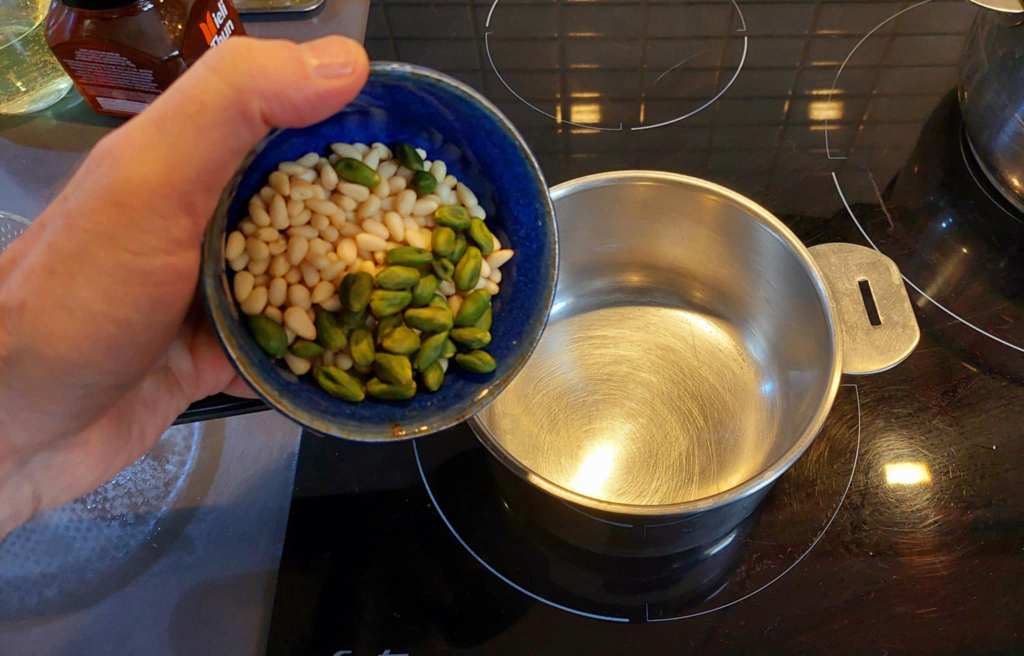 … faire torréfier des pignons de pins et des pistaches salés dans une petite casserole.