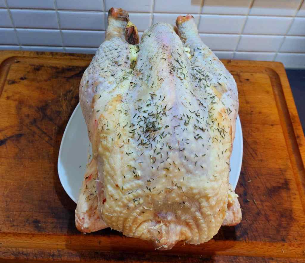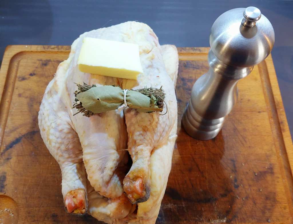 Mais procédons dans l’ordre. J’ai vidé la bête, je l’ai massée avec du gros sel et du poivre, après avec du beurre. Ensuite, j’ai parsemé l’extérieur de l’animal de thym, de persil et d’origan, et j’ai ajouté un morceau de beurre et un bouquet d’aromates à l’intérieur.