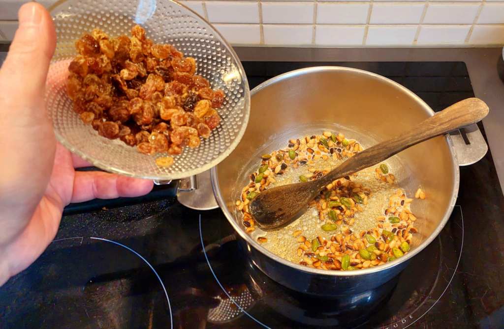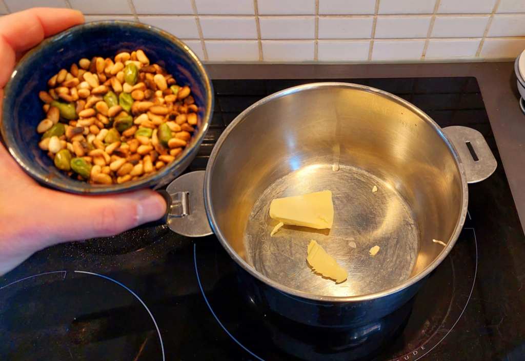 A présent, il faut faire fondre un peu de beurre dans une casserole, puis y ajouter les pignons et les pistaches.