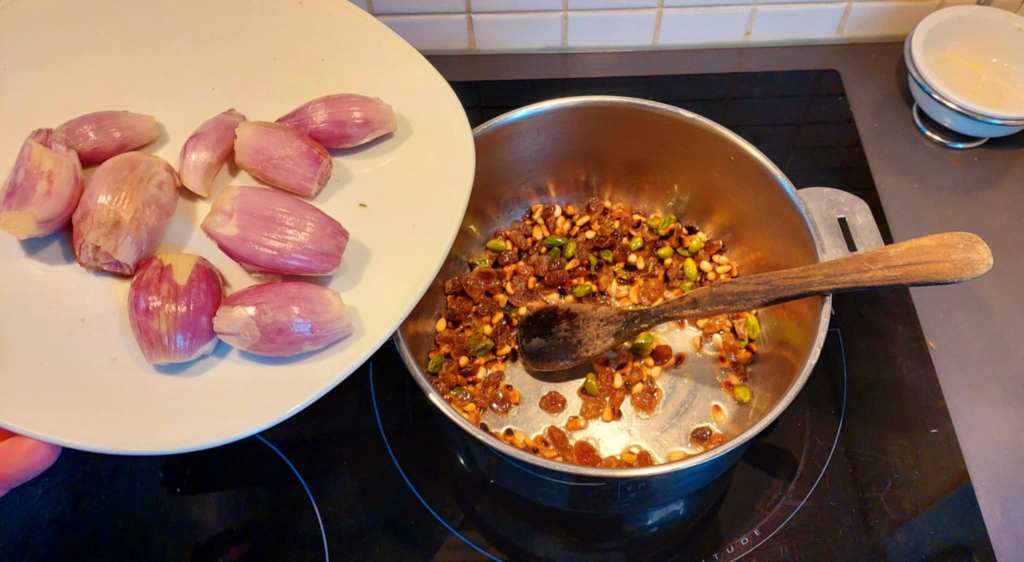 … et des échalotes pelées. Touillez un bref instant avec une cuillère en bois, en attendant que les différents ingrédients libèrent leurs jus…