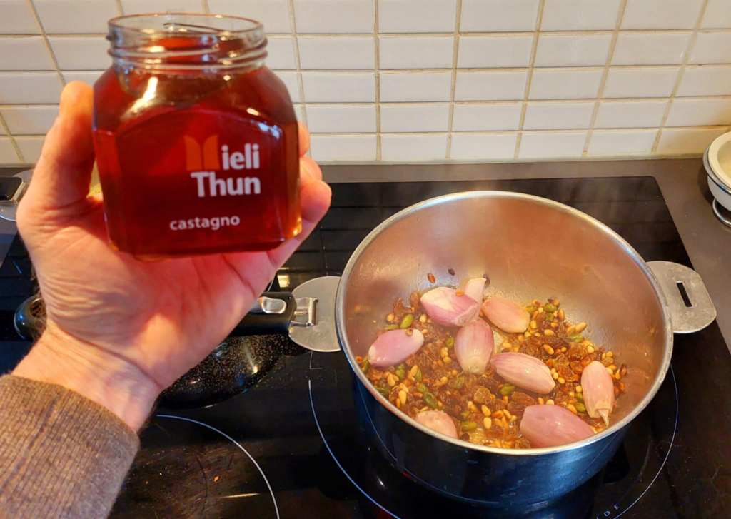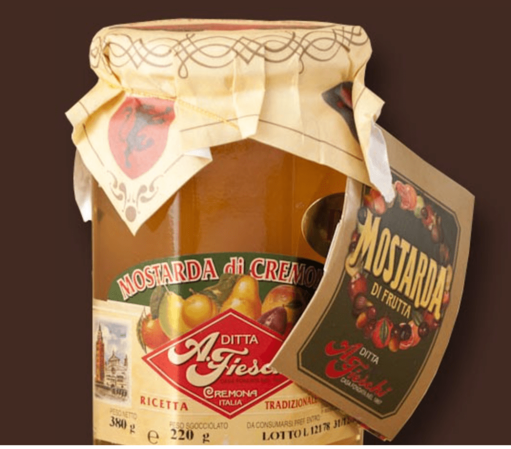 Au dernier moment, faites réduire la sauce de pignons, échalotes, etc. Et dégainez le dernier ingrédient de cette recette… la mostarda di frutta (moutarde aux fruits) de Crémone (ou de Mantoue, ou de Vicence). Une mostarda qui n’a rien à voir avec la moutarde française. Je vais vous expliquer pourquoi.