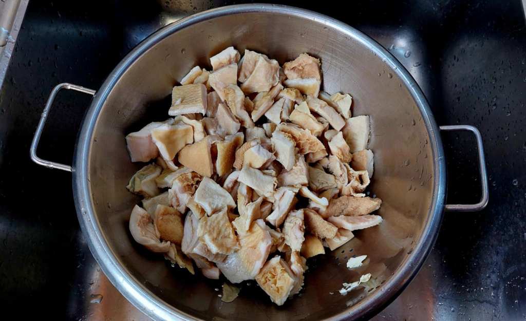 Ingrédients pour 4 personnes : 1,5 kg d’abomasum (caillette) de veau, une branche de céleri, deux oignons, deux gousses d’ail, un bouquet de persil, quelques feuilles de laurier, poivre noir en grain (beaucoup), quelques baies de genièvre, une tomate mûre (type grappe), gros sel.