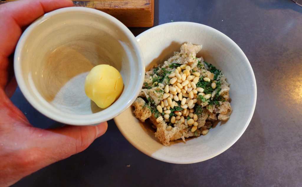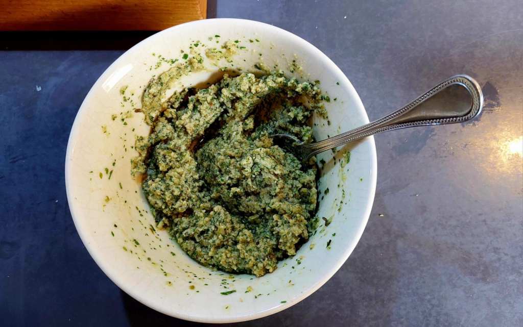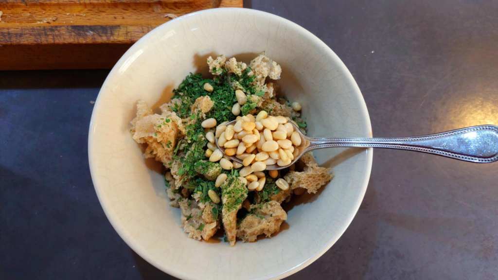 …persil, pignons de pain, huile d’olive extra vierge, vinaigre de vin blanc, sel, poivre noir moulu…