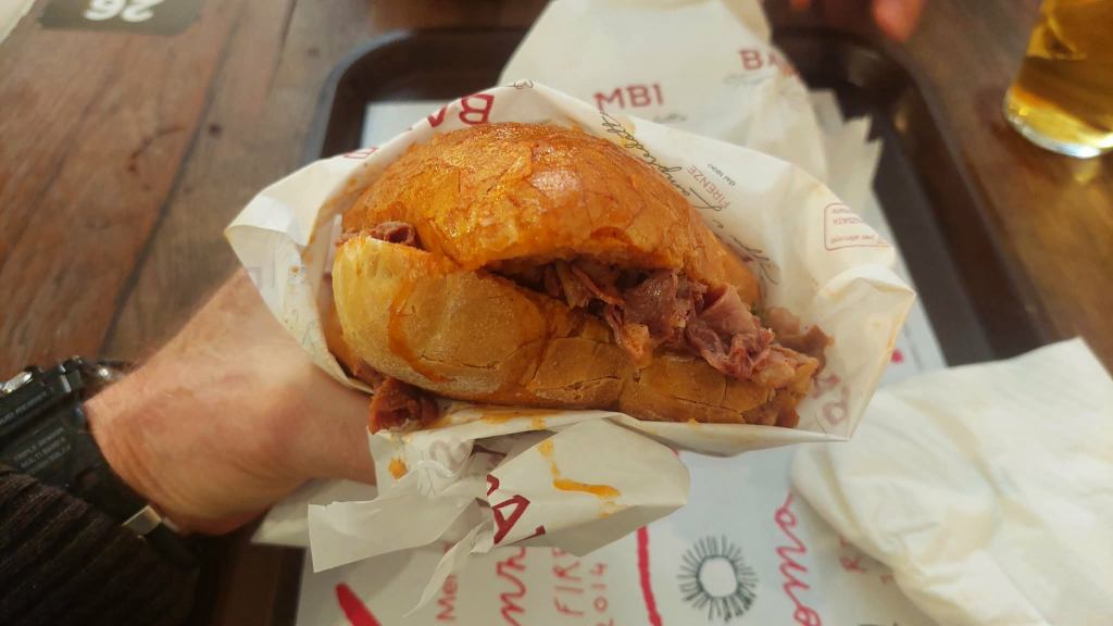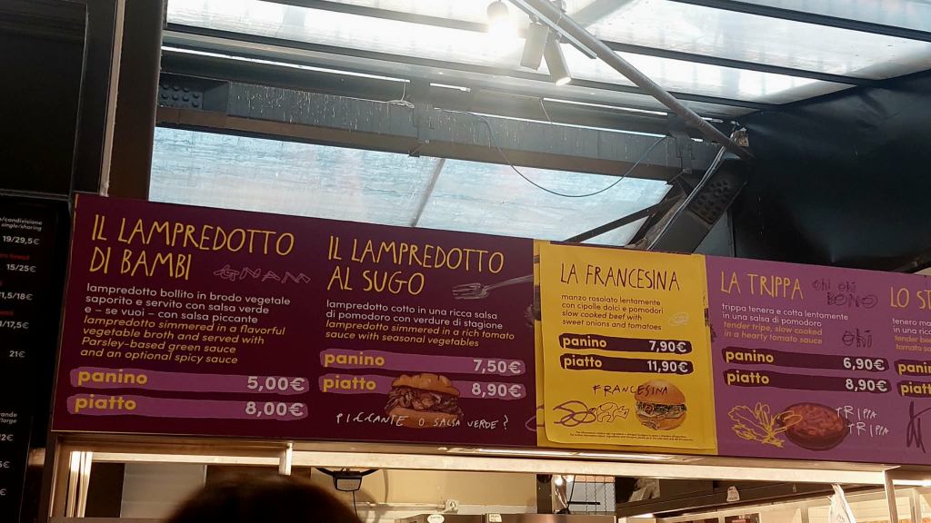 De nos jours, hélas, la lamproie a pratiquement disparu en raison de la pollution massive de l’Arno, causée par les microplastiques, les tanneries et les résidus de l’industrie textile. Mais pas la caillette ! Me voici donc au marché couvert de Florence, en extase devant le kiosque du lampredotto (et bien plus encore). Et ici comme partout ailleurs dans la ville, les prix sont encore raisonnables, pour des portions vraiment copieuses : 5 euros le panino !