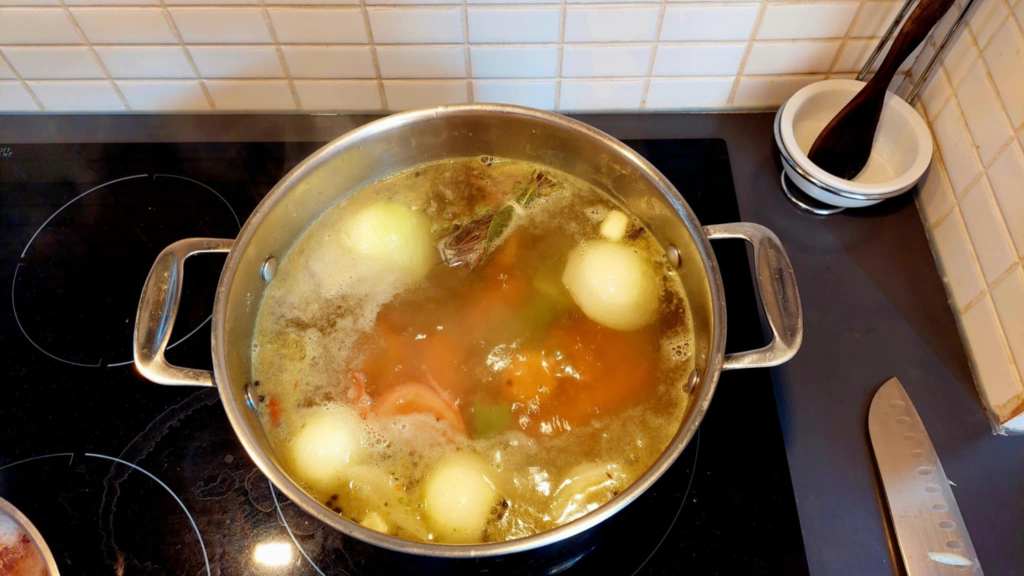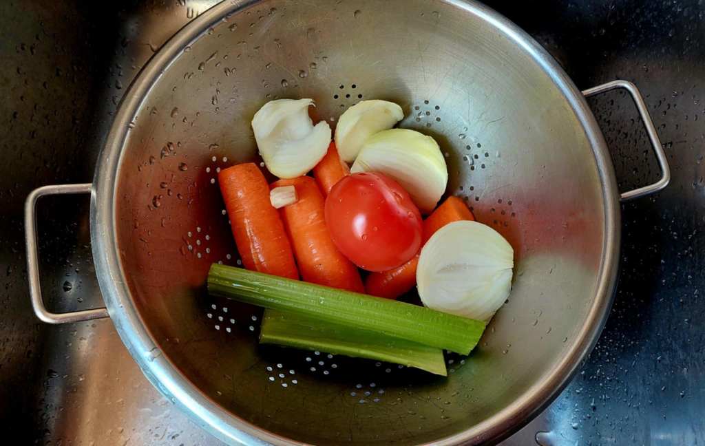 Ensuite, il faut préparer les ingrédients à mettre à bouillir dans la casserole. Plus précisément : une branche de céleri, des oignons pelés, des carottes, de l’ail pelé, du persil, des feuilles de laurier, des grains de poivre, des baies de genièvre et une tomate coupée en quartiers.