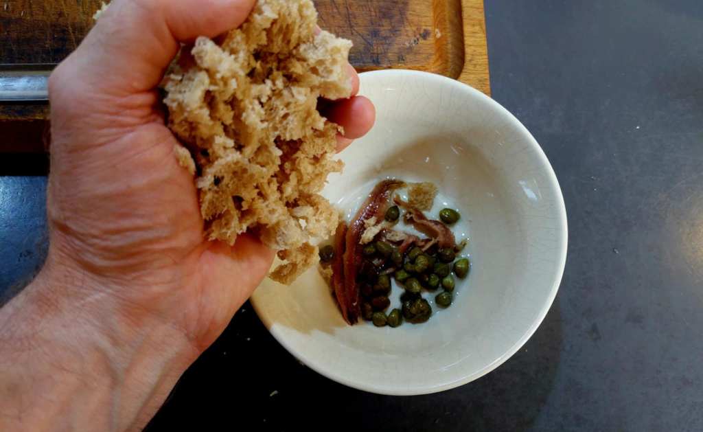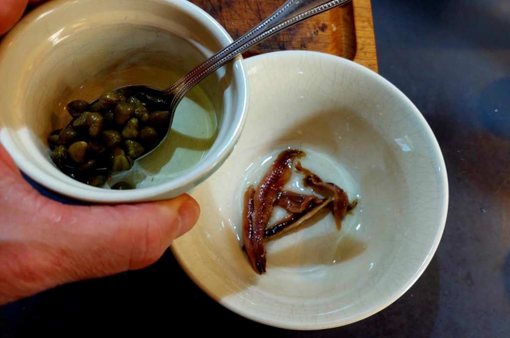 Entre temps, il y a un ingrédient indispensable à ne pas oublier : la sauce verte, à base de câpres au vinaigre, filets d’anchois…
